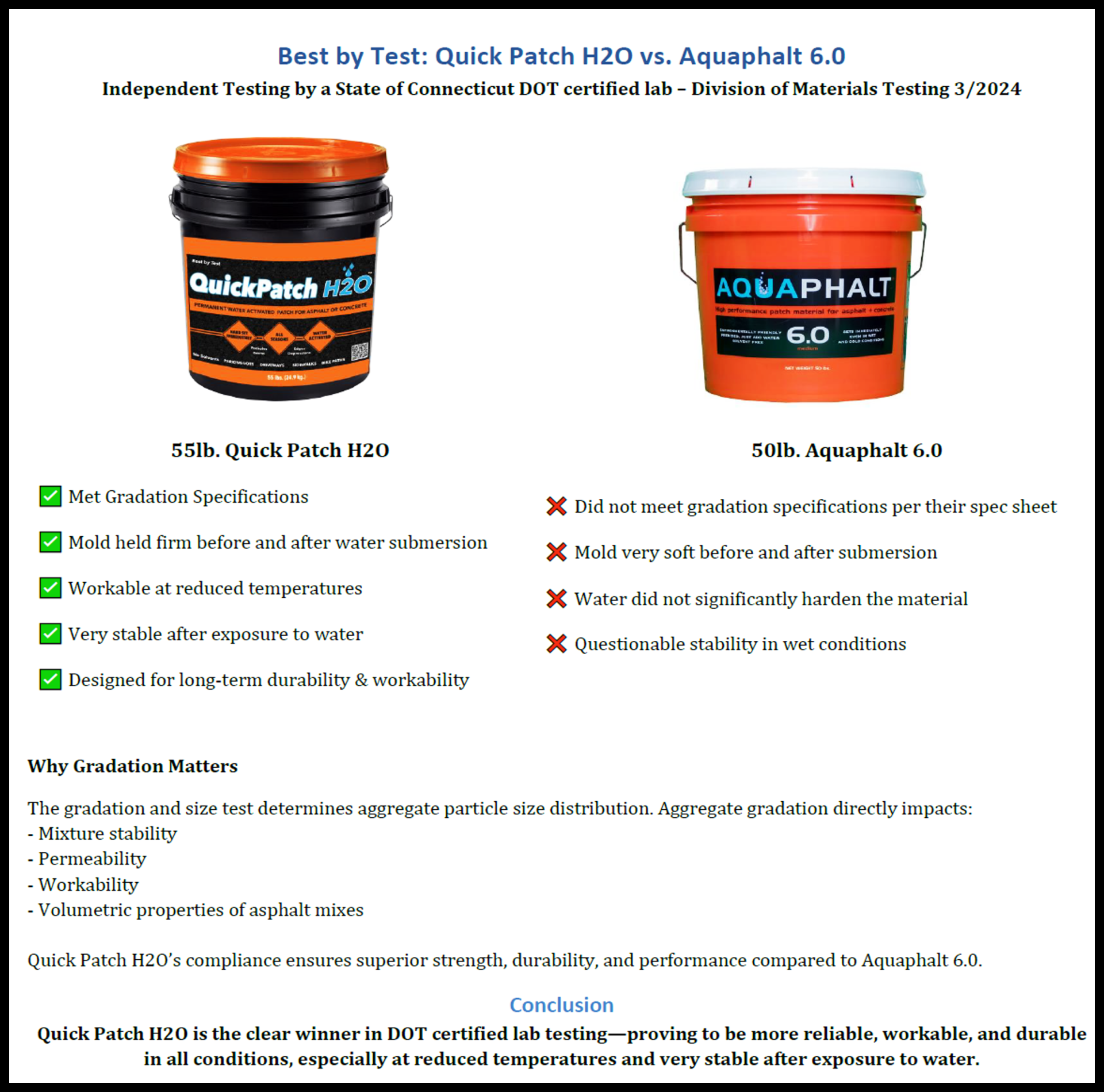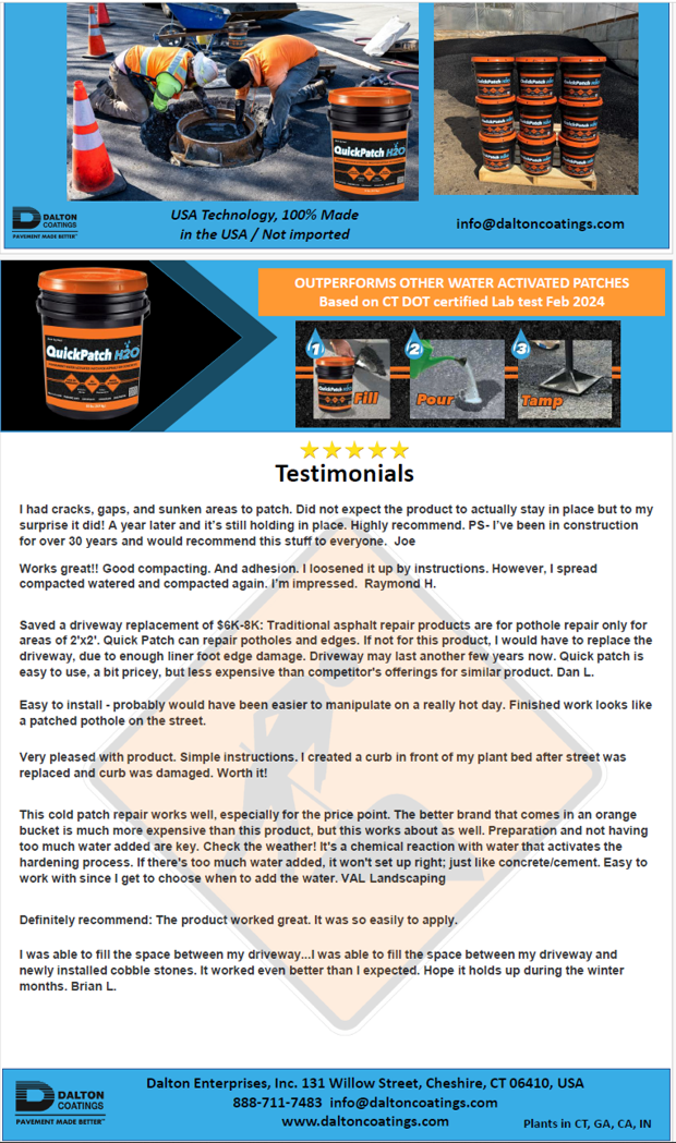 It has been tested by a certified asphalt lab and outperforms other water activated patches.