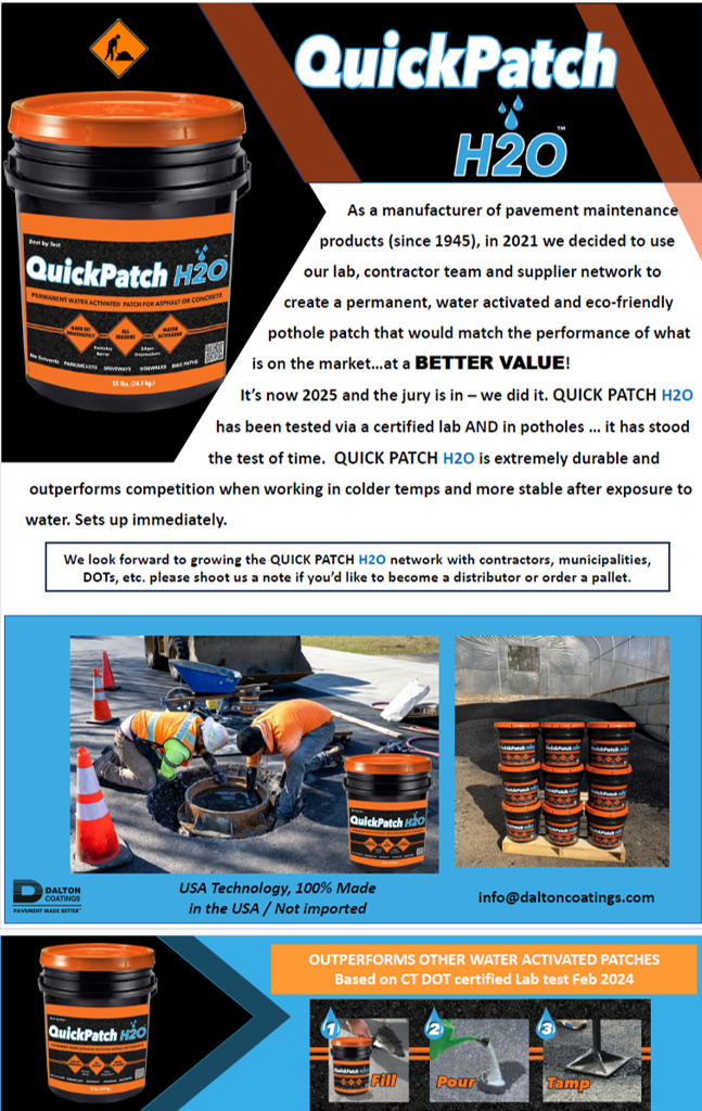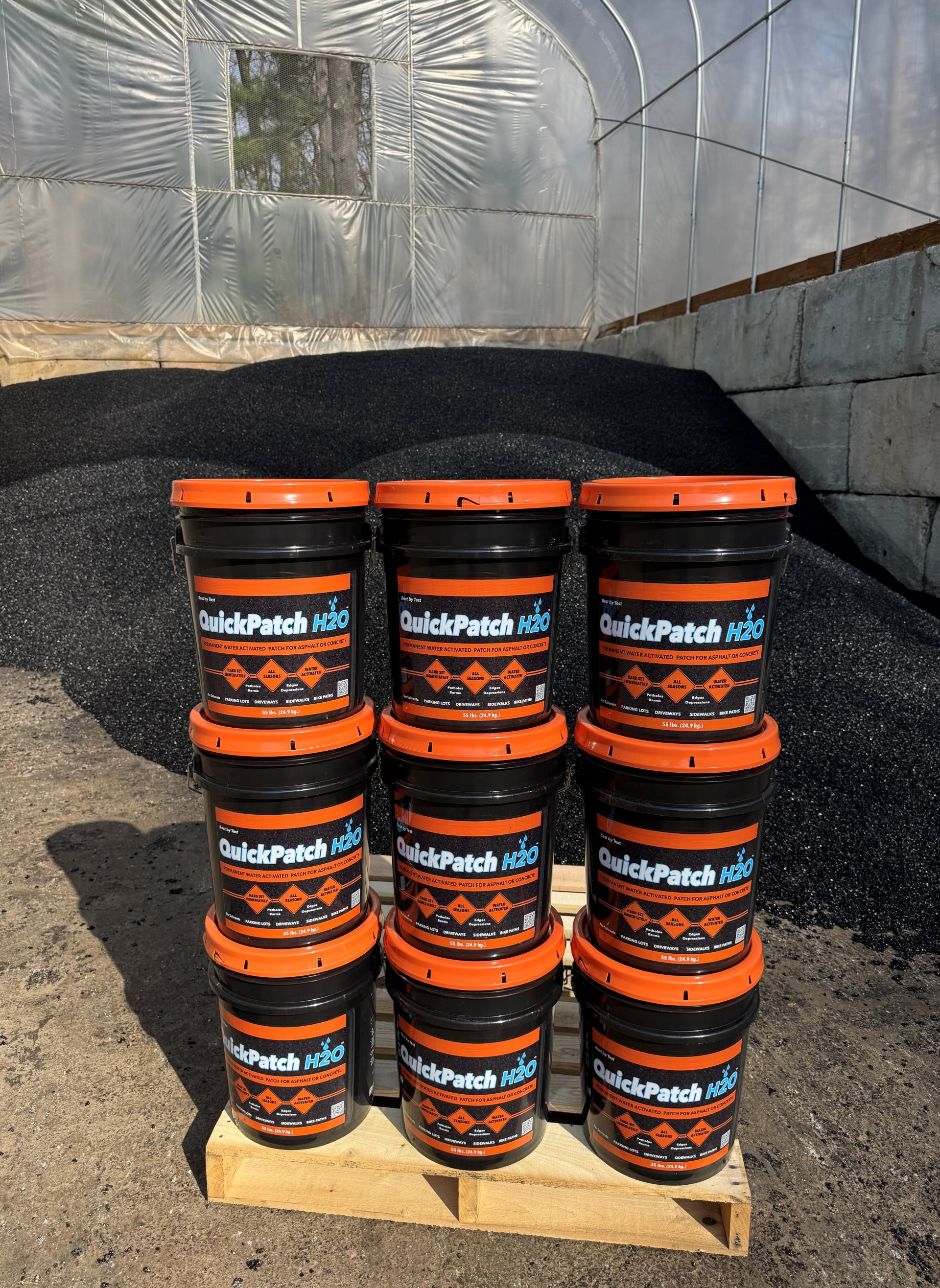 Quick Patch H2OTM is a water activated, fast setting patch for both asphalt and concrete that gives a permanent result. Quick Patch H2OTM is traffic ready immediately and leaves a solid black, texturized finish. It's the ONLY 100% MADE IN THE USA Water Activated pothole patch.